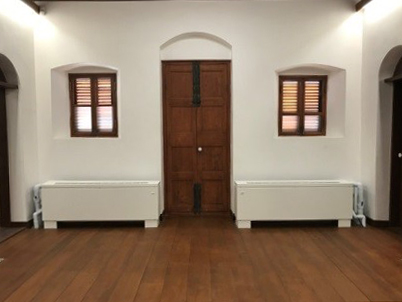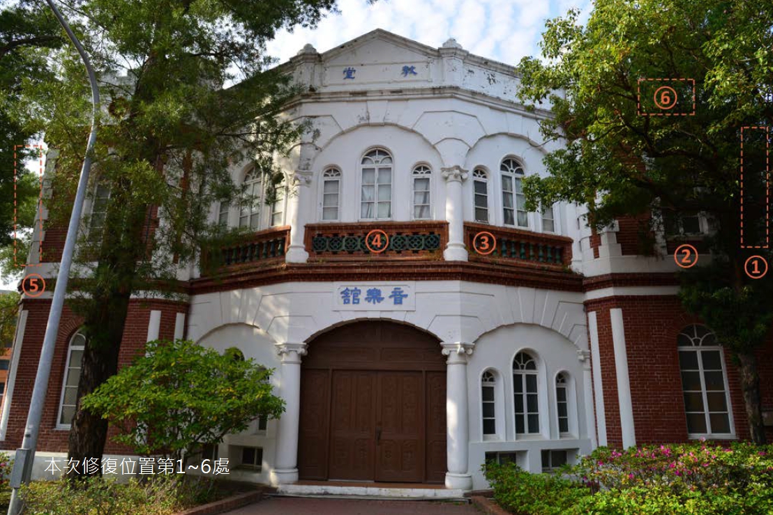 市定古蹟原臺南長老教中學校講堂木窗因使用已久,有多扇窗戶已經損壞。講堂正立面中間數樘木窗因室內裝潢板阻隔,須搭設鷹架由外部修復,而架上實際檢測發現二樓木窗損壞情形超出原計畫修復範圍。本次修復木窗位於講堂東側、西側及正立面,計劃範圍外木窗發現腐朽損壞處亦作填縫及修補。