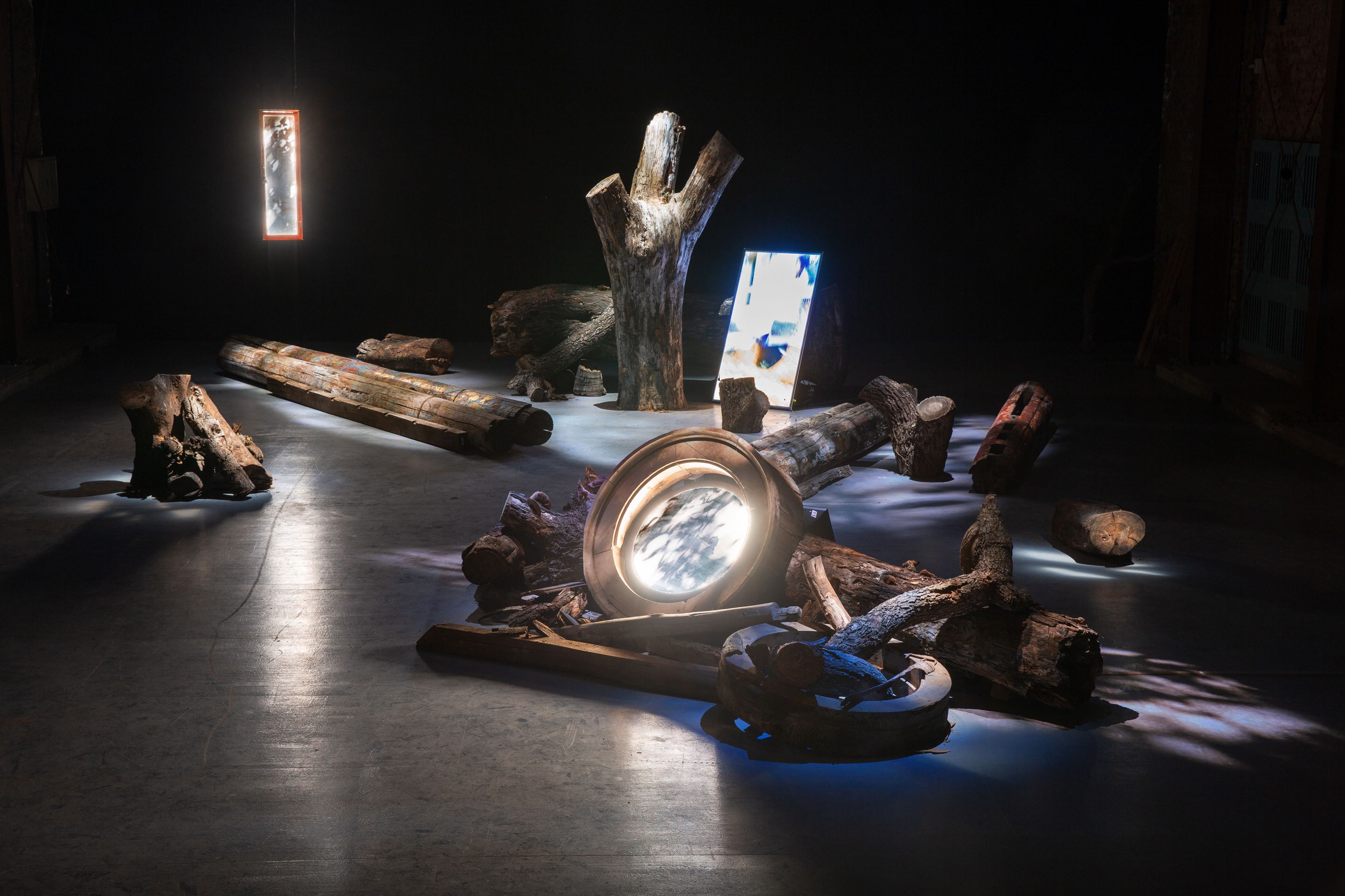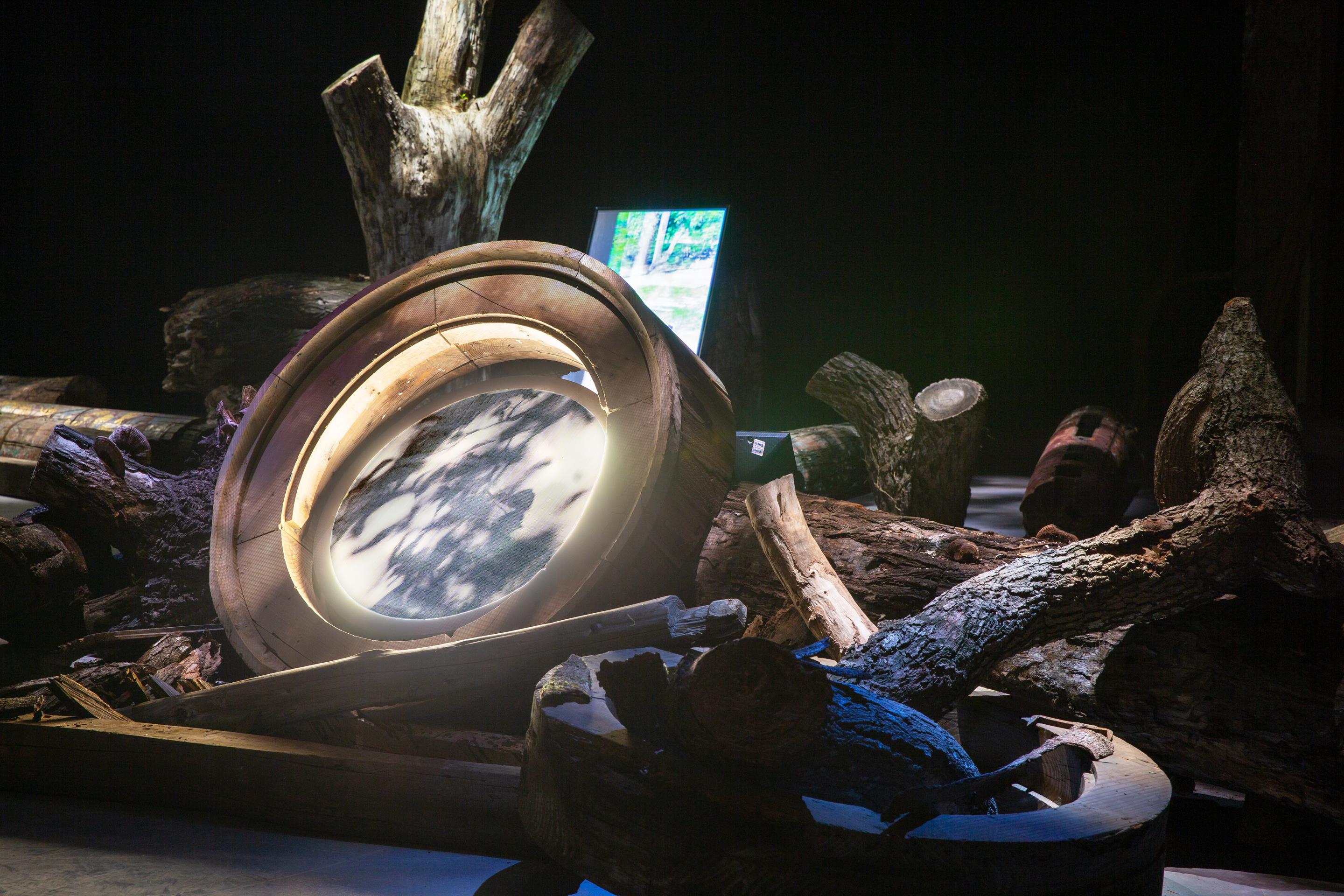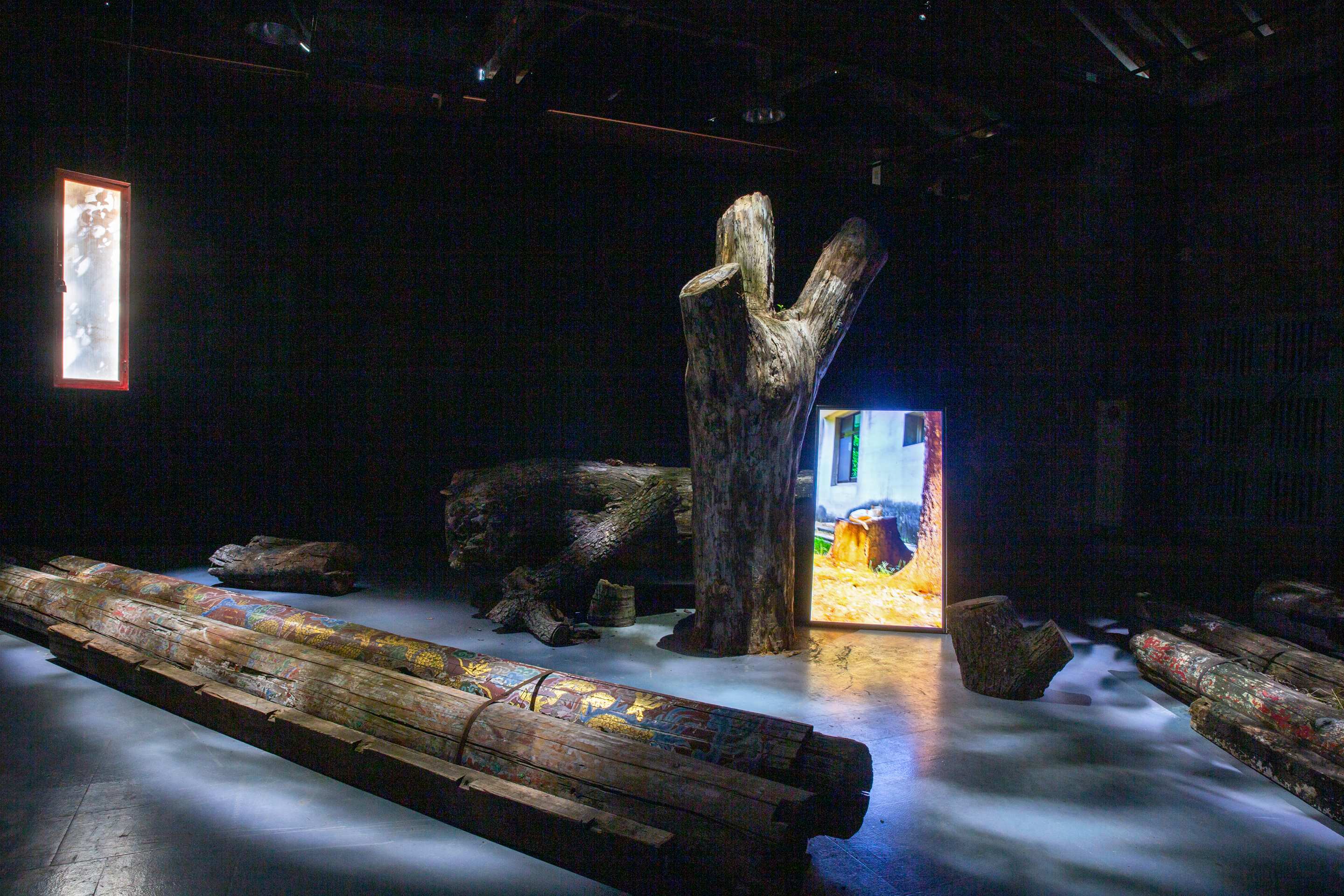 藝術家撿拾周邊樹木的斷枝殘幹,向文資建材銀行借用建材舊料如腐朽的樑柱、閒置的牛眼窗等,轉化為創作的素材,並拍攝具生活感的影像,透過燈箱與投影裝置,將室內展場營造出有如微風吹拂般的森林,帶領觀眾體驗虛實交錯的魔幻日常。