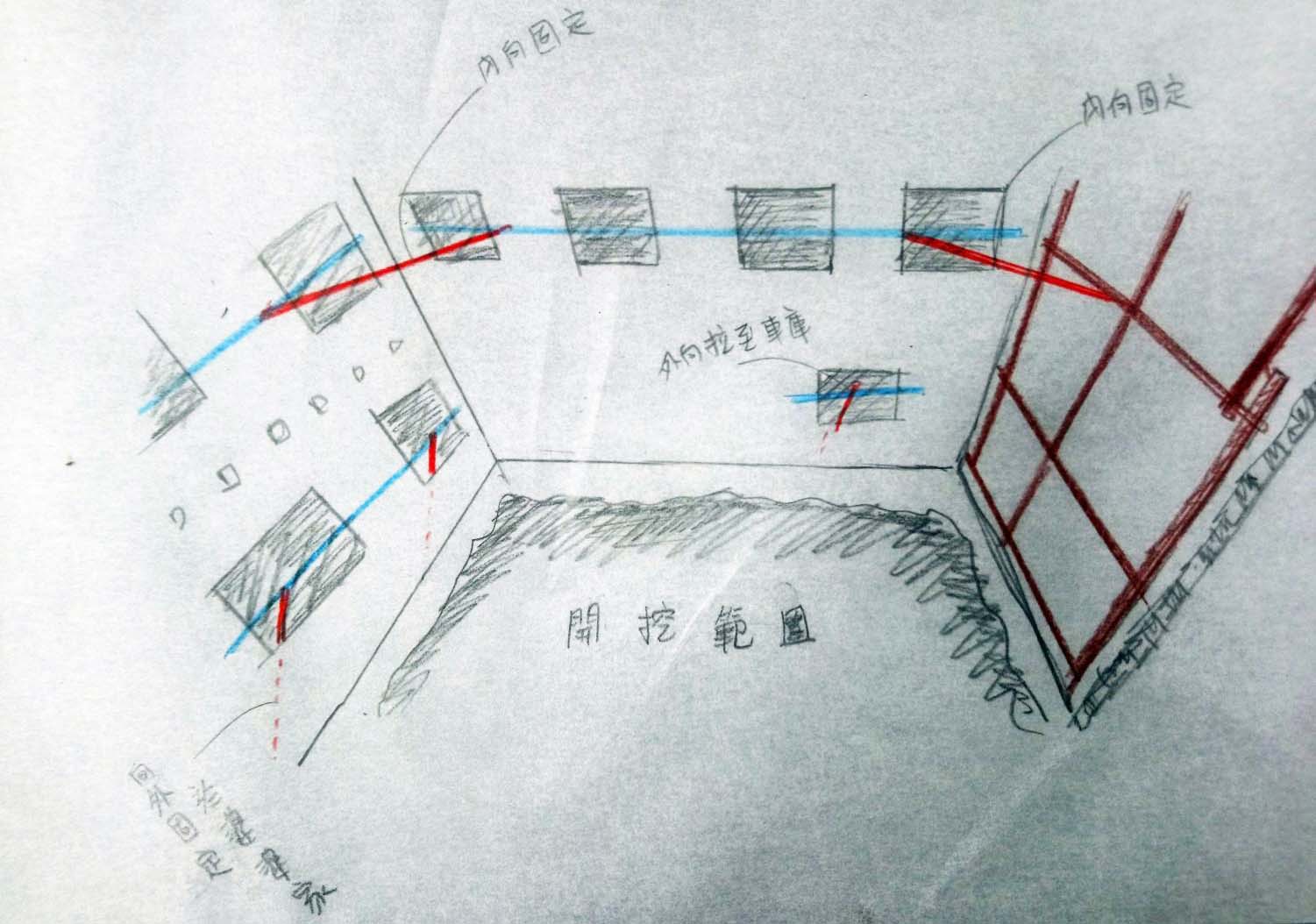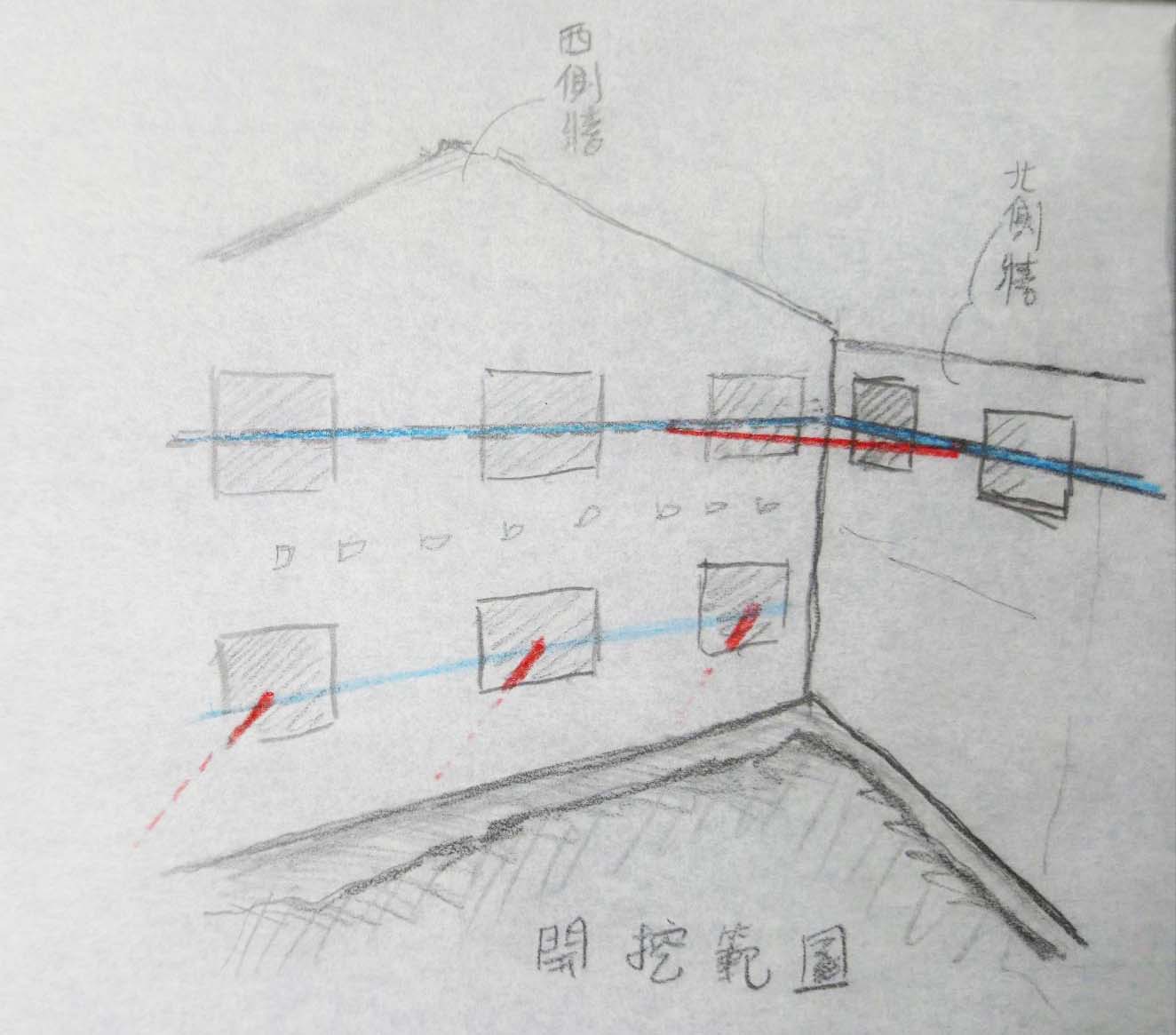 於修復工程進場後,因後期增建物拆除及磚牆面層剔除後,發現北側(8 號及8-1號)周圍留設之牆體有部分隱蔽處之裂隙。經檢討後,為確保北側(8 號及8-1 號)周圍留設之牆體於後側量體基礎及鋼構架未完成前,不受地震及豪雨所可能導致之土方軟化的情事,且於108 年11 月29 日邀及專業委員協助現勘,認定有立即性之危險,故決議針對隱蔽處之裂隙進行緊急性之結構補強,並請營造單位善用舊料進行施作,故於109 年1 月以承商庫存之舊料進行後方增建物東側牆面之支撐,並於109 年4月請本府文化局協助向本市文資建材銀行申請木料以進行北向及西向之牆面支撐。施作前皆請承商提出牆體暫支撐補強及加固之大樣圖說,送予監造單位審核及機關審定後,方據以施作。