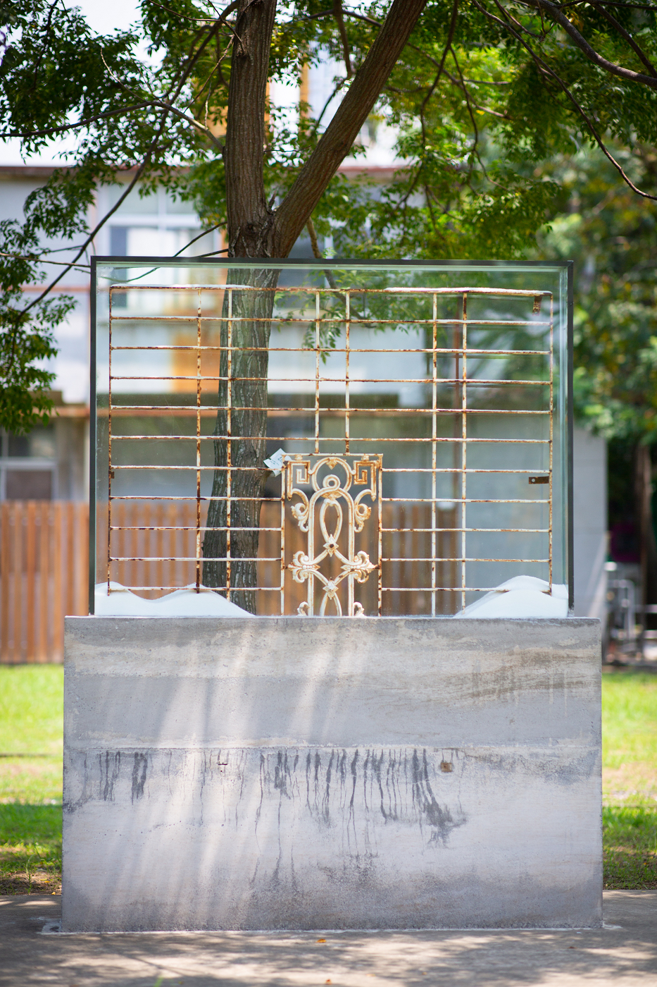 徐思穎表示,剛到這裡的前幾天,發現不管在宿舍或是戶外,都有許多昆蟲及螞蟻,因為這邊前身是糖廠,所以想在這裡幫牠們找一個新家。特別前往文資建材銀行找到司法博物館及附近民宅的鐵花窗,外面用玻璃罩住,內部裝滿特級白砂糖並留下管道,打造糖廠的小型共同生活圈,而目前已經有許多螞蟻進駐在裡面了。